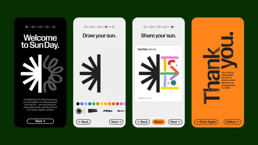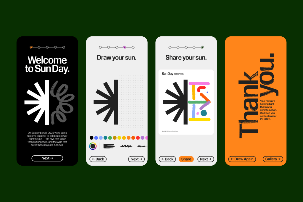 That idea — anchored by a half-drawn sun waiting for each of us to finish — captures the genius of the approach. COLLINS’ bold yet flexible identity system transforms environmentalism from an abstract political project into a participatory act of authorship. The design solution is radical in its simplicity: a sun that is never complete until someone decides to make it so. It is paired with a digital commons, where anyone from Tulsa to Tahiti can draw their own sun, place it in a global gallery, and instantly see themselves as part of a collective. And it is amplified through a living typeface, one built to echo the handmade urgency of protest posters, designed to be remixed, redrawn, and claimed by the people it serves. These design assets turn a symbol into a living, participatory movement.