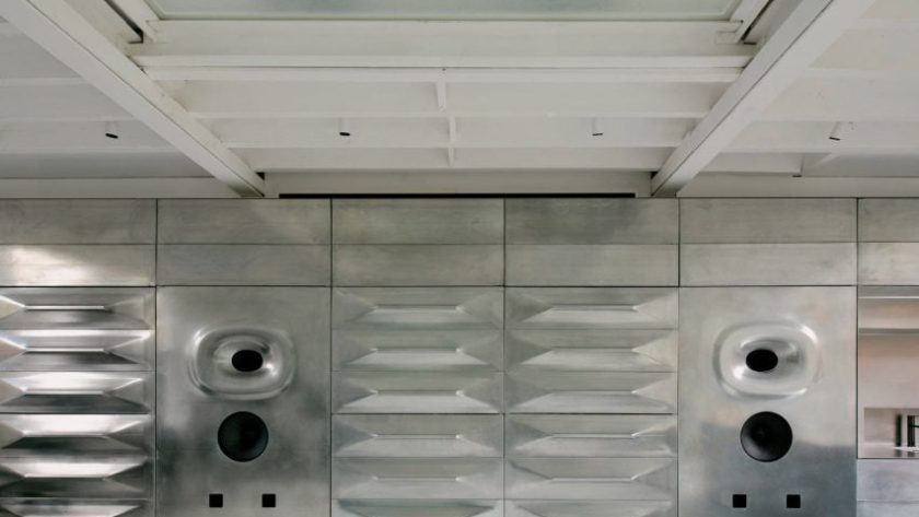 It’s all about metal at Salt Salon in London’s Borough Market (above and top image), which also functions as an events space and features a sound wall made from repurposed galvanised steel (pictured top).
