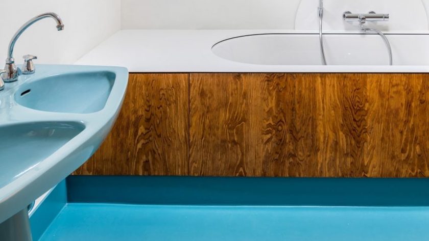 A bubblegum-blue colour picked from the original facade of this former 1960s dental practice features throughout the interior’s floor, including in the bathroom.