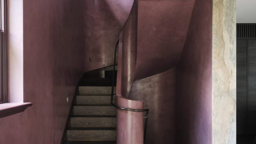 The house’s dramatic colour palette aims to provide a “modern gothic” feel informed by Bram Stoker’s novel Dracula. Inky blue tones and cool steel finishes combine with deep burgundy hues, including the custom marmorino Venetian plaster applied in the entryway and staircase.