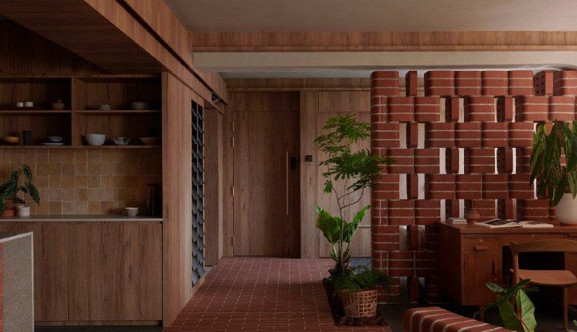 Double-bullnose brick referencing the older parks of Singapore informed the renovation of In a Park, a flat redesigned by architecture studio L Architects.
