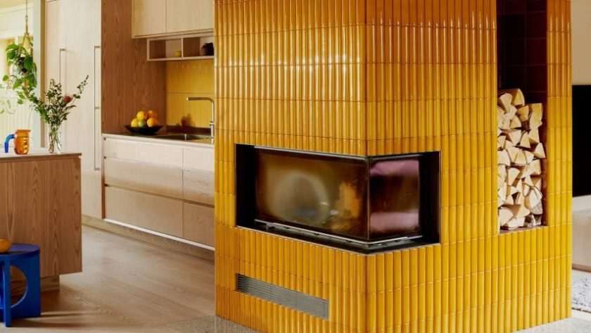 Design duo Familien Kvistad clad this blocky mustard-yellow fireplace in fluted Kaufmann tiles, creating a sculptural accent in the living space of this renovated house in Oslo, Norway.