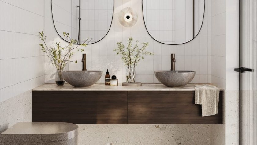 The Soft collection is part of Woodio‘s bathroom furniture offering, which uses wood composite as a low-carbon alternative to traditional ceramics that need to be fired at high temperature.